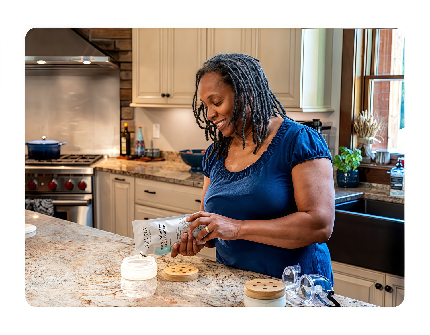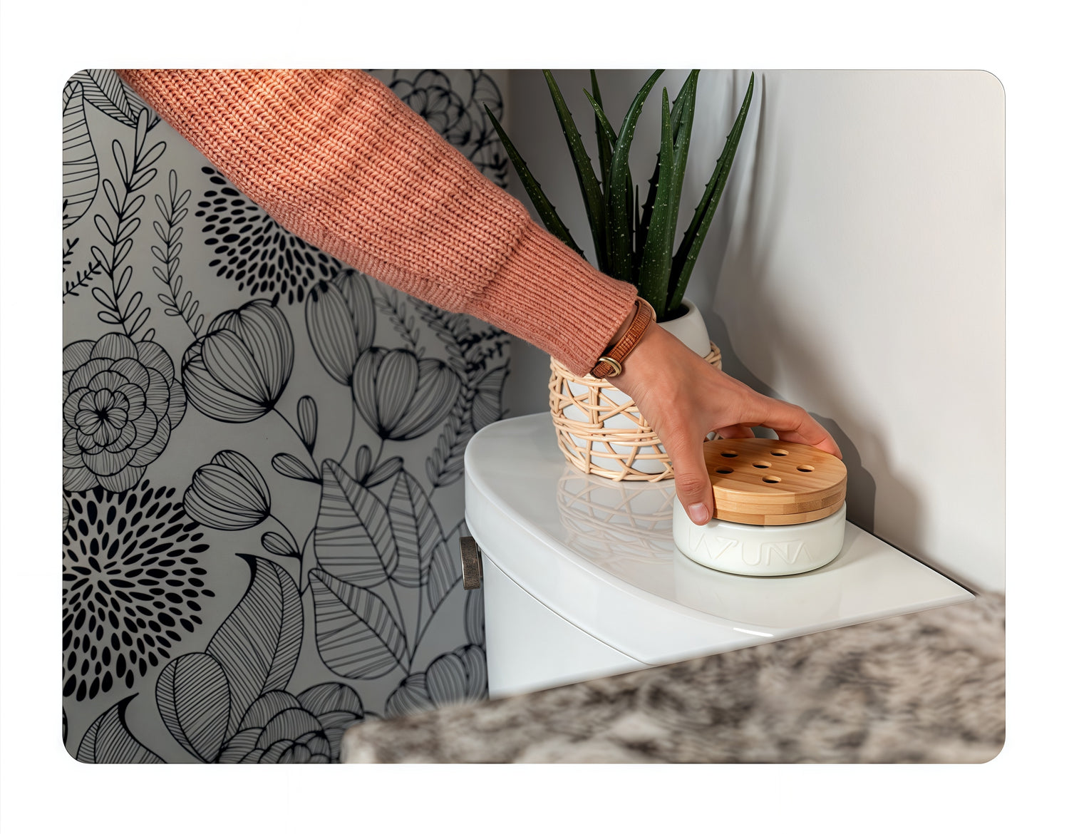 Azuna gel products use a dual-action process to neutralize odors caused by microbes. Our tea tree oil-based formula works continuously through a combination of evaporative diffusion and natural airflow, discreetly eliminating odors for up to ninety days. Our slow-release formula ensures that Azuna is constantly treating your air.